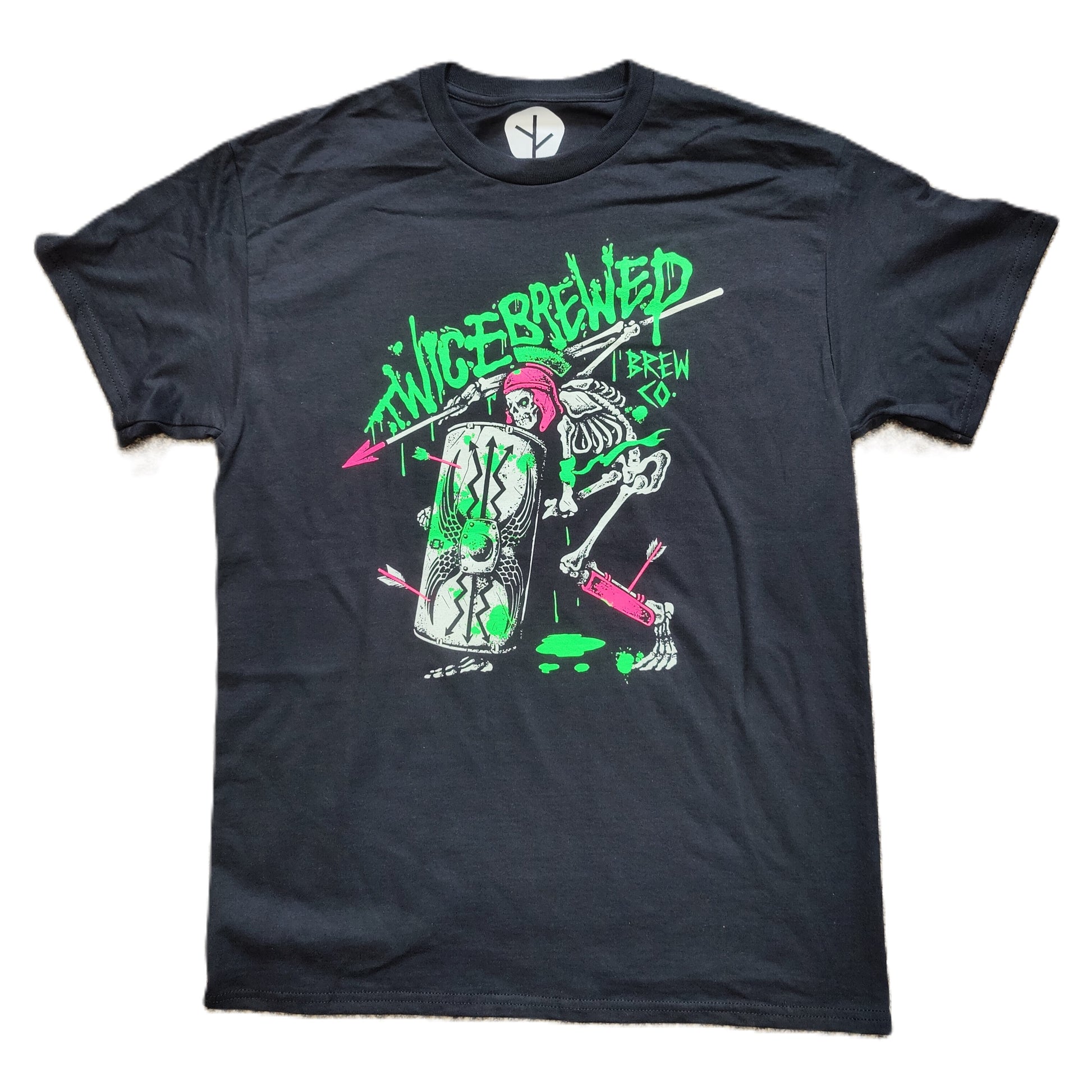 Designed by GRVEYARDSHFT, 3 colour screen print Roman skeleton soldier design with glow in the dark ink, featuring vibrant green and pink colours..